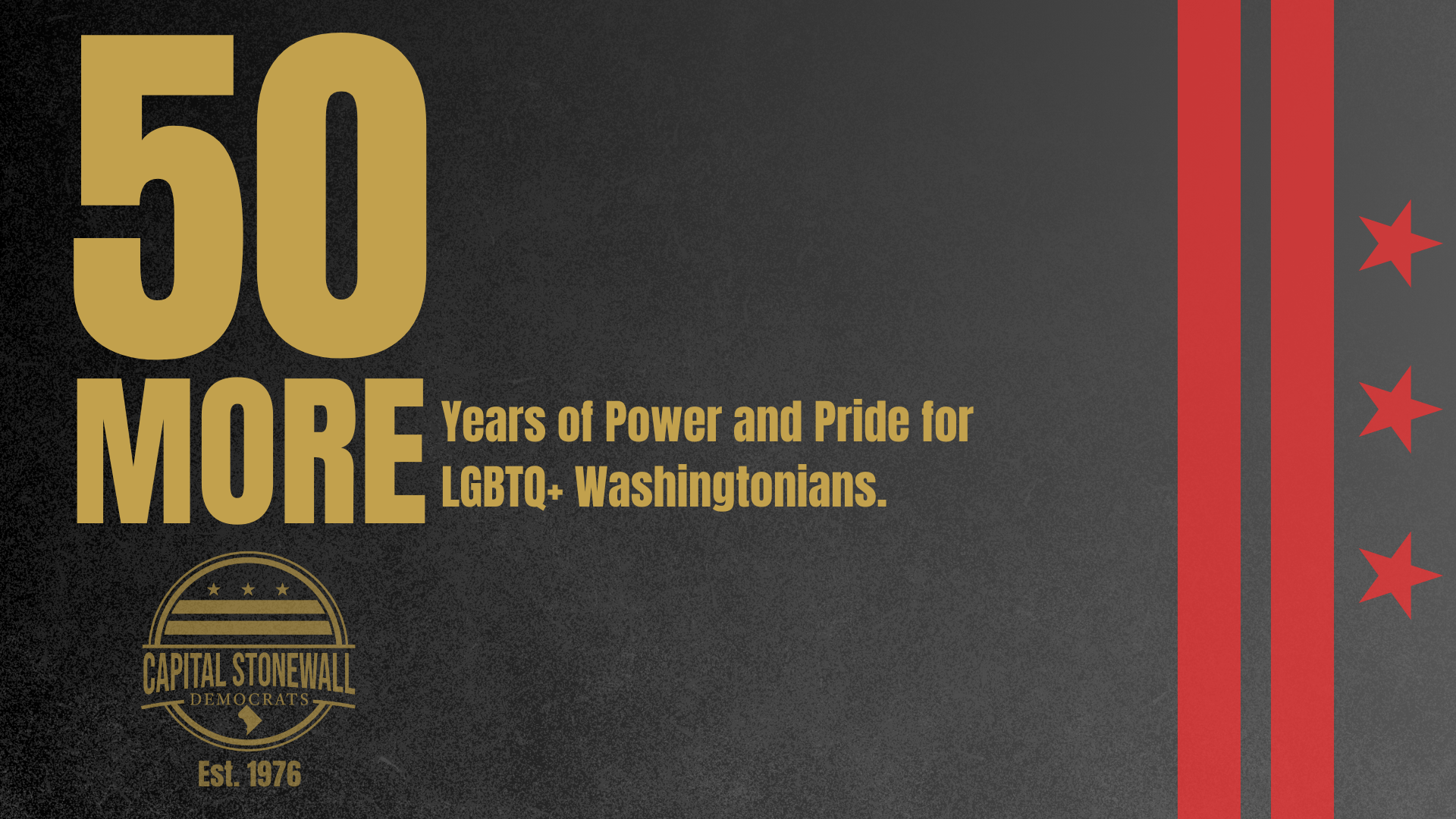 Join Capital Stonewall Democrats for our 50th anniversary celebration, a special evening honoring the past and shaping the future. For 50 years, our club and our community have pushed DC forward through advocacy, leadership, and the power of showing up for one another. Now we gather to remember that history and ignite the work that lies ahead.