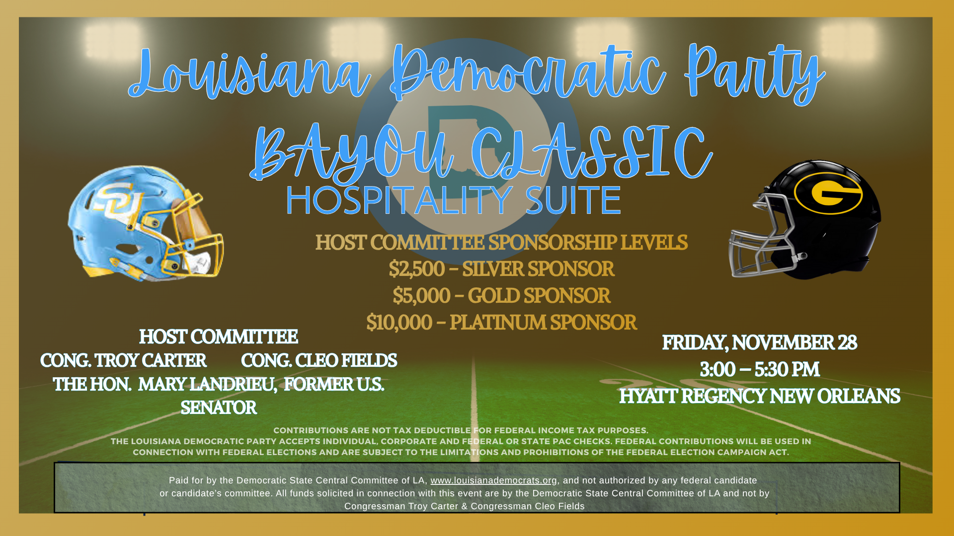 Bayou Classic Weekend in style!Your contribution helps us continue building Democratic strength across Louisiana β supporting voter engagement, leadership development, and grassroots organizing in every parish.